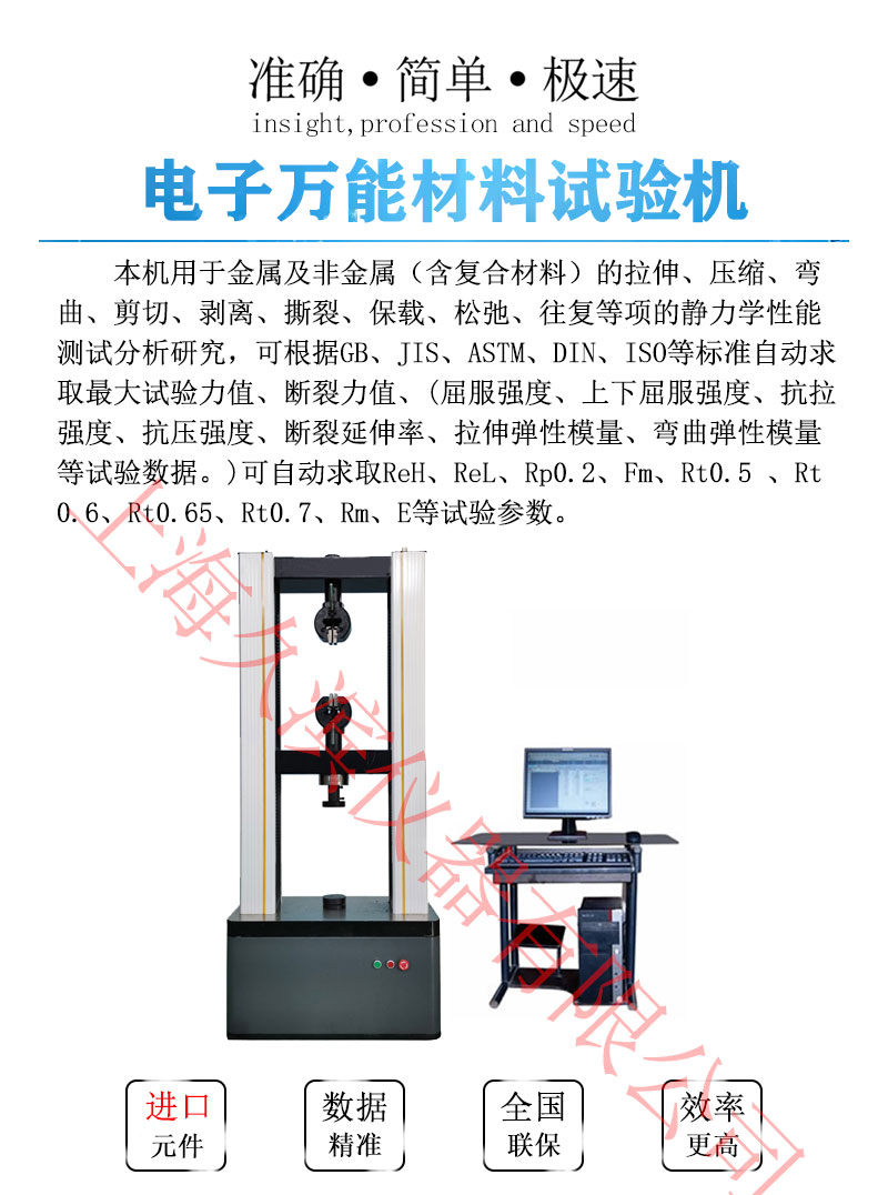 本機用于金屬及非金屬(含復合材料)的拉伸、壓縮、彎曲、剪切、剝離、撕裂、保載、松弛、往復等項的靜力學性能測試分析研究,可根據GB、JIS、ASTM、DIN、ISO等標準自動求取*大試驗力值、斷裂力值、(屈服強度、上下屈服強度、抗拉強度、抗壓強度、斷裂延伸率、拉伸彈性模量、彎曲彈性模量等試驗數據。)可自動求取ReH、ReL、Rp0.2、Fm、Rt0.5 、Rt0.6、Rt0.65、Rt0.7、Rm、E等試驗參數。