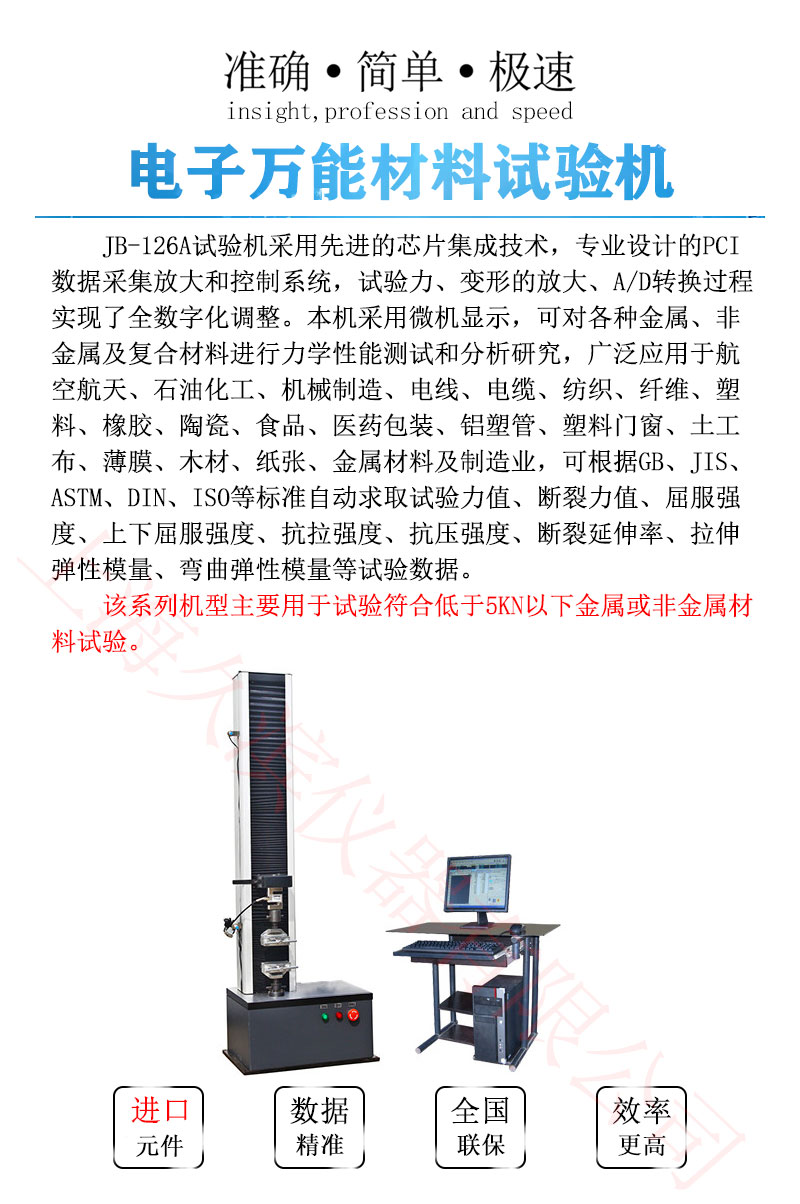 該試驗機采用芯片集成技術,專業(yè)設計的PCL數(shù)據(jù)采集放大和控制系統(tǒng),試驗力、變形的放大、A/D轉(zhuǎn)換過程實現(xiàn)了全數(shù)字化調(diào)整。本機采用微機顯示,可對各種金屬、非金屬及復合材料進行力學性能測試和分析研究,廣泛應用于航空航天、石油化工、機械制造、電線電纜、紡織、纖維、塑料、橡膠、陶瓷、食品、醫(yī)藥包裝、鋁塑管、塑料門窗、土工布、薄膜、木材、紙張、金屬材料及制造業(yè),可根據(jù)GB、JIS、ASTM、DIN、ISO等標準自動求取試驗力值、斷裂力值、屈服強度、上下屈服強度、抗壓強度、抗拉強度、斷裂延伸率、拉伸彈性模量、彎曲彈性模量等試驗數(shù)據(jù)。