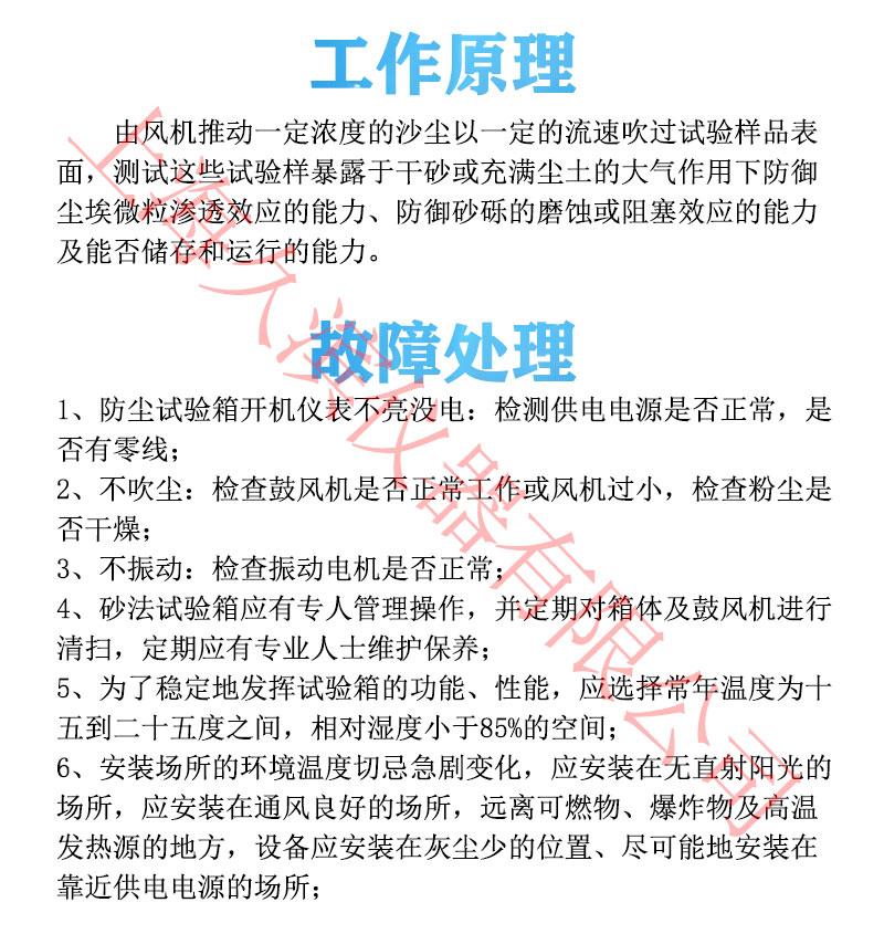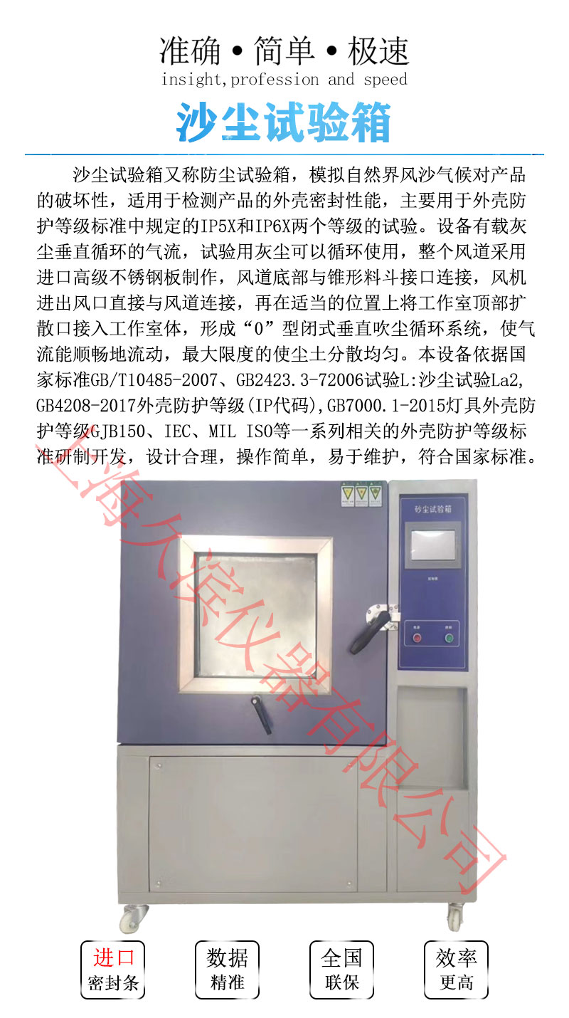 沙塵試驗(yàn)箱模擬自然界風(fēng)沙氣候?qū)Ξa(chǎn)品的破壞性,適用性檢測(cè)產(chǎn)品的外殼密封性能,主要有于外殼防護(hù)等級(jí)標(biāo)準(zhǔn)中規(guī)定的IP5X和IP6X兩個(gè)等級(jí)的試驗(yàn)。設(shè)備有載灰塵垂直循環(huán)的氣流,試驗(yàn)用灰塵可以循環(huán)使用,整個(gè)風(fēng)道采用進(jìn)口高級(jí)不銹鋼板制作,風(fēng)道底部與錐形料斗接口連接,風(fēng)機(jī)進(jìn)出風(fēng)口直接與風(fēng)道連接,再在適當(dāng)?shù)奈恢蒙蠈⒐ぷ魇翼敳繑U(kuò)散口接入工作室體,形成“O”型閉式垂直吹塵循環(huán)系統(tǒng),使氣流能順暢地流動(dòng),*大限度的使塵土分散均勻。