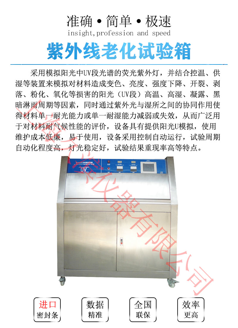 陽光和濕氣對材料的破壞,每年造成數以萬計的經濟損失,紫外光耐氣候試驗箱可以再現陽光、露水所產生的破壞。試驗箱通過將待測材料曝曬放在經過控制的陽光和濕氣的交互循環中,同時提高溫度的方式來進行試驗,試驗箱采用紫外線熒光燈模擬陽光,同時通過冷凝的方式模擬濕氣影響。