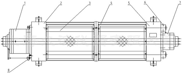1.張拉千斤頂   2.左橫梁   3.立柱   4.防護罩    5.右橫梁    6.緊固螺母     7.空心傳感器    8.活塞位移測量裝置