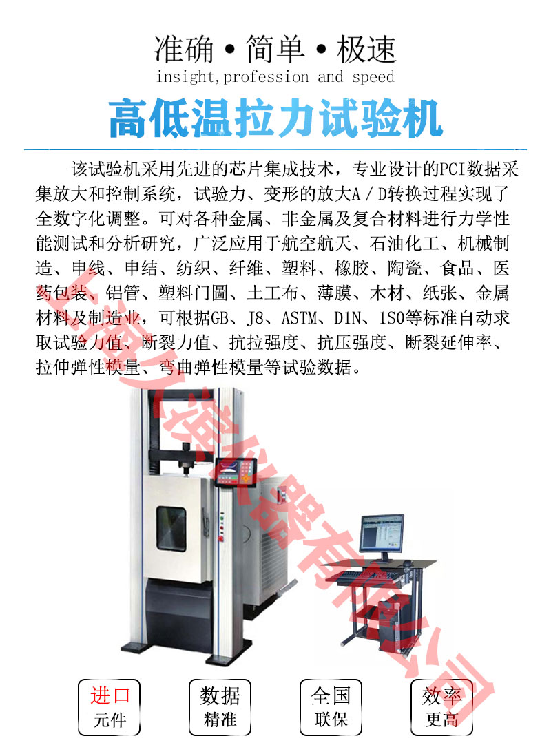 高低溫鋁合金試驗機采用的芯片集成技術,專業設計的PCI數據采集放大和控制系統,試驗力、變形的放在A/D轉換過程實現了全數字化調整。可對各種金屬、非金屬及復合材料進行力學性能測試和分析研究,廣泛應用于航空航天、石油化工、機械制造、申線、申結、紡織、纖維、塑料、橡膠、陶瓷、食品、醫藥包裝、鋁管、塑料門圖、土工布、薄膜、木材、紙張、金屬材料及制造業,可根據GB、JB、ASTM,D1N、1SO等標準自動求取zuì大試驗力值、斷裂力值、抗拉強度、抗壓強度等試驗數據。