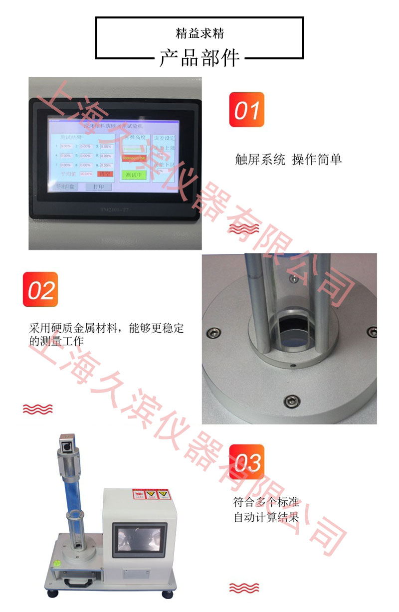 專業測海綿,泡沫,橡膠等軟質材料而設計的一款高性價比的儀器,本機按照GB/T6670-2008設計制造,符合ASTM美標D3574及ISO8307測試標準.同時符合日本汽車座墊用氨基甲酸乙酯泡沫SES N3296的試驗方法.適用于測定軟質聚氨酯泡沫塑料的落球式回彈性能.本儀器通過給定直徑和質量的鋼球在規定高度上自由落在泡沫塑料試樣上,計算鋼球回彈的*大高度與鋼球落下高度比值的百分率既回彈率,以回彈率表示泡沫塑料的回彈性能。該機采用微處理器進行控制,液晶中文顯示,并可打印試驗數據。該機具有使用安全,可靠,測量精度高等特點。