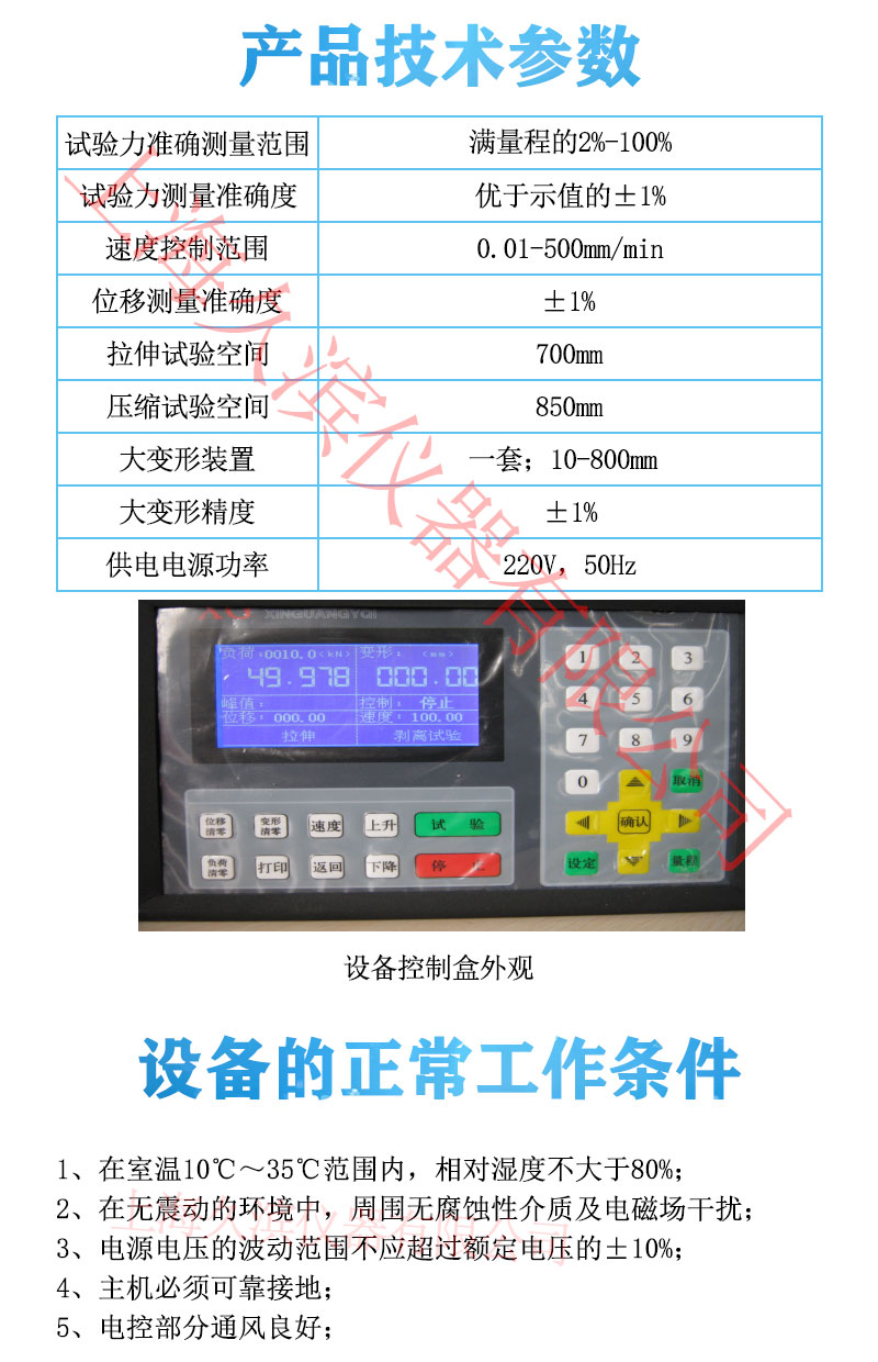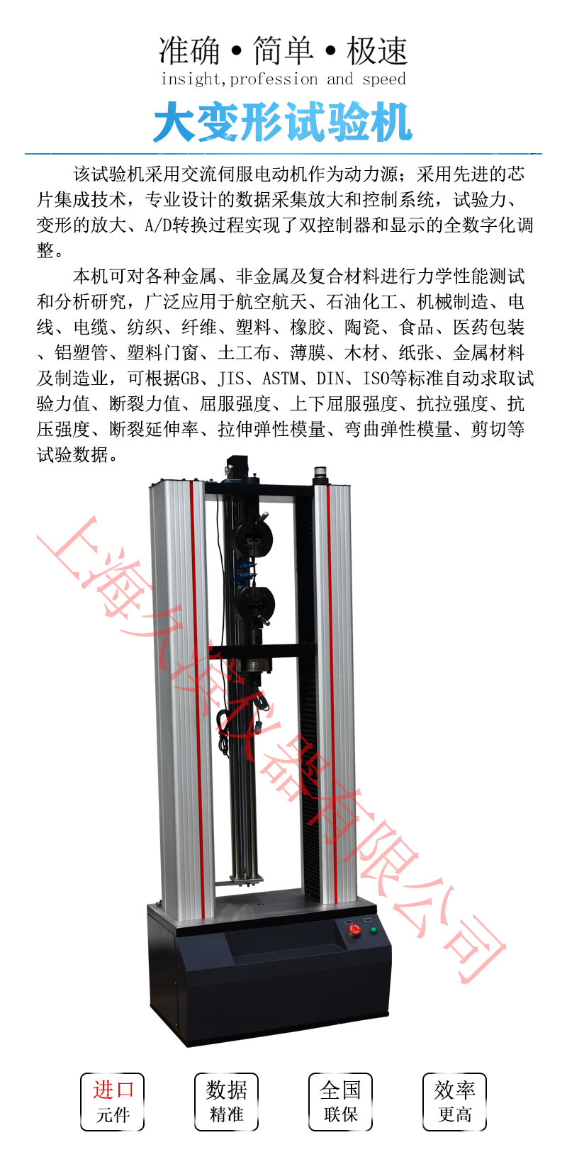 該試驗機采用交流伺服電動機作為動力源;采用先進的芯片集成技術,專業(yè)設計的數(shù)據(jù)采集放大和控制系統(tǒng),試驗力、變形的放大、A/D轉換過程實現(xiàn)了雙控制器和顯示的全數(shù)字化調整。