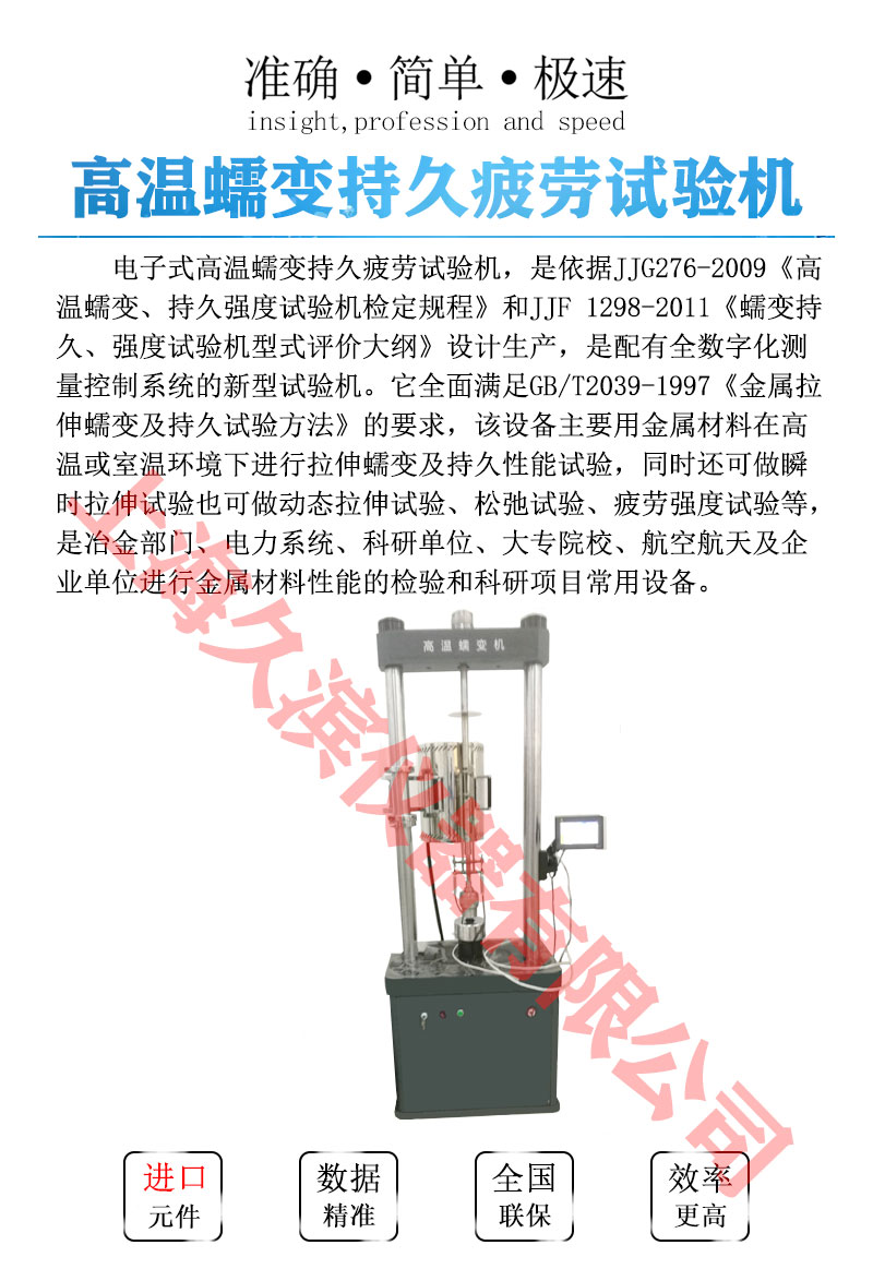 電子式蠕變及持久強度試驗機, 是依據JJG276-2009 《高溫蠕變、持久強度試驗機檢定規程》和JJF 1298-2011《蠕變持久、強度試驗機型式評價大綱》設計生產,是配有全數字化測量控制系統的試驗機。它全面滿足GB/T2039-1997《金屬拉伸蠕變及持久試驗方法》的要求,該設備主要用金屬材料在高溫或室溫環境下進行拉伸蠕變及持久性能試驗,同時還可做瞬時拉伸試驗也可做動態拉伸試驗、松弛試驗、疲勞強度試驗等,是冶金部門、電力系統、科研單位、大專院校、航空航天及企業單位進行金屬材料性能的檢驗和科研項目常用設備。