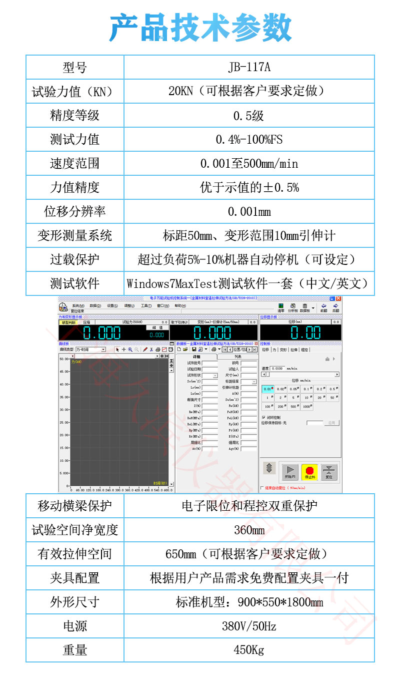 JB-117A電子萬能材料試驗機是電子技術與機械傳動相結合的新型材料試驗機,它具有寬廣準確的加載速度和測試力范圍,對載荷、變型、位移的測量和控制有較高的精度和靈敏度。本機采用機電一體化設計,主要由測力傳感器、變送器、微機處理器、負荷驅動器、計算機及彩色噴墨打印機構成。高精度調速電動機可設置無級試驗速度。各集成構件間均采用插接方式連接。落地式機型,造型涂裝均勻分考量了現代工業設計,人體及工程學之間相間原則。