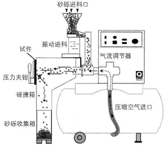 像吉利:Q/JLY J711120-2009、東風汽車:Q/EQY-252-2010的企業標準,砂粒選擇尺寸為4~5mm的經過淬火的鑄鐵丸,帶有棱角,而且要求進行兩輪沖擊,所以它受到的損傷會更大。每次噴射(500±5)g的砂粒,壓力為0.1bar,砂粒需在(10±2)s 內全部平行噴射到試樣上。