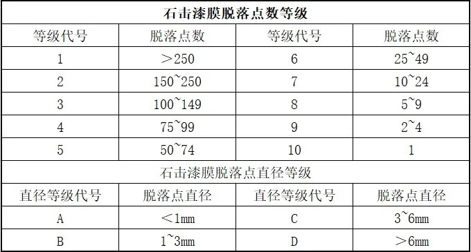 將試樣表面涂層的破損、脫落情況與標準特征類型(石擊等級識別圖)比較、分析,以判定該涂層的抗石擊性能。(參考下圖)
