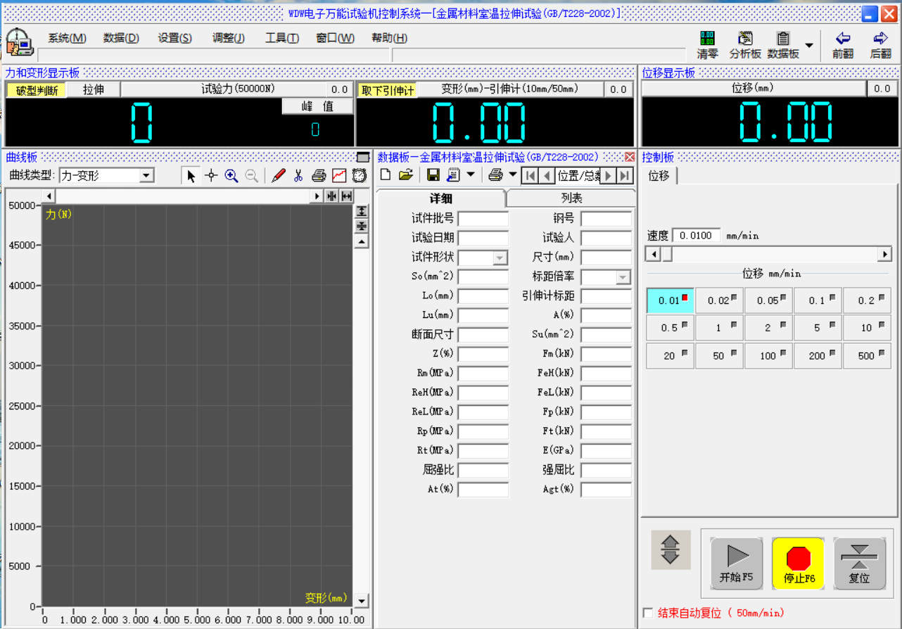 8、動態顯示:測試過程中,負荷、伸長、位移及選中的試驗曲線隨著測試的進行,實時動態顯示在主控屏幕上。